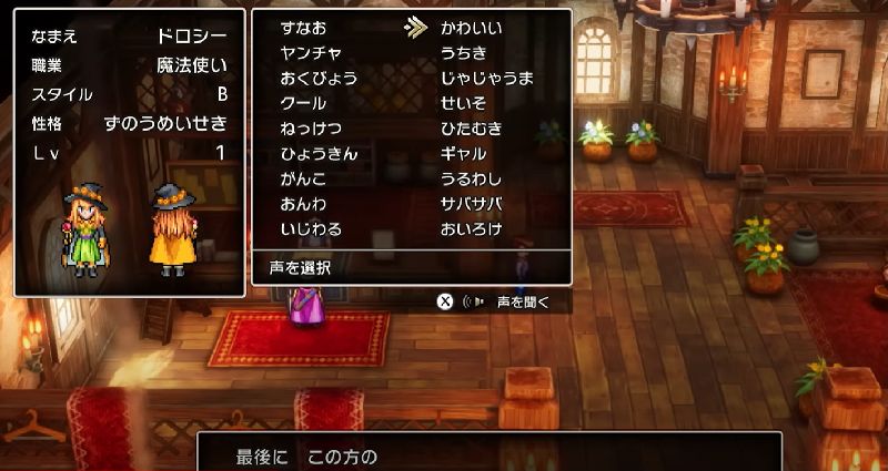性格も選べて(確かSFC版でもあったね)、それによってセリフが変わるので「声を聞く」という項目があるようです