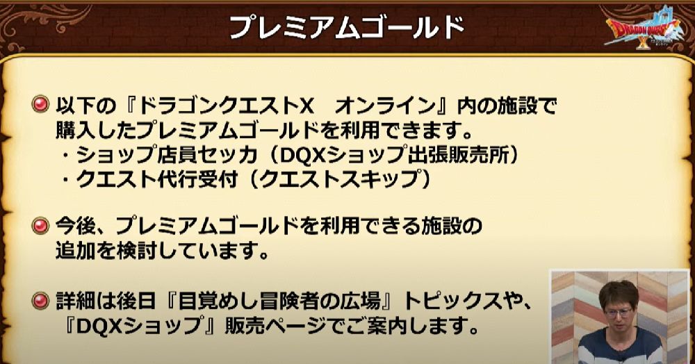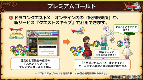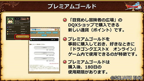 「プレミアムゴールド」は、「目覚めし冒険者の広場」の「DQXショップ」で購入できる「新しい通貨(ポイント)」です。